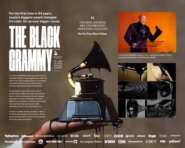 The Black GRAMMY was created to shine a light on the creative influence of Black artistry within music’s highest institution. Developed in connection with Dr. Dre’s Global Impact Award, the idea sought to recognize the individuals and innovations that have shaped the sound and spirit of modern music. The strategy centered on acknowledgment - bringing visibility to the voices behind culture’s most defining moments while honoring a legacy that continues to move music forward. The Black GRAMMY became a moment of visibility and pride - an affirmation that creativity, in all its forms, deserves to be seen, credited, and celebrated at the highest level.